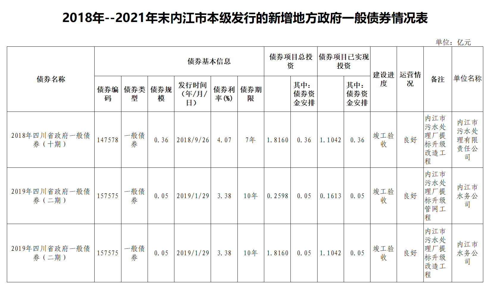 2018年--2021年末内江市本级发行的新增地方政府一般债券情况表