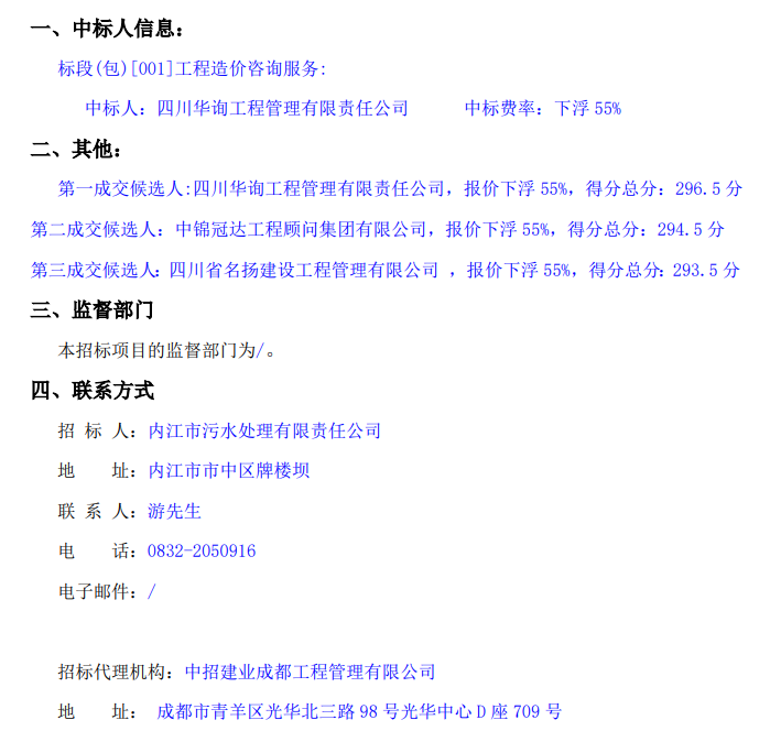 内江市第二污水处理厂二期工程造价咨询服务项目中标结果公示