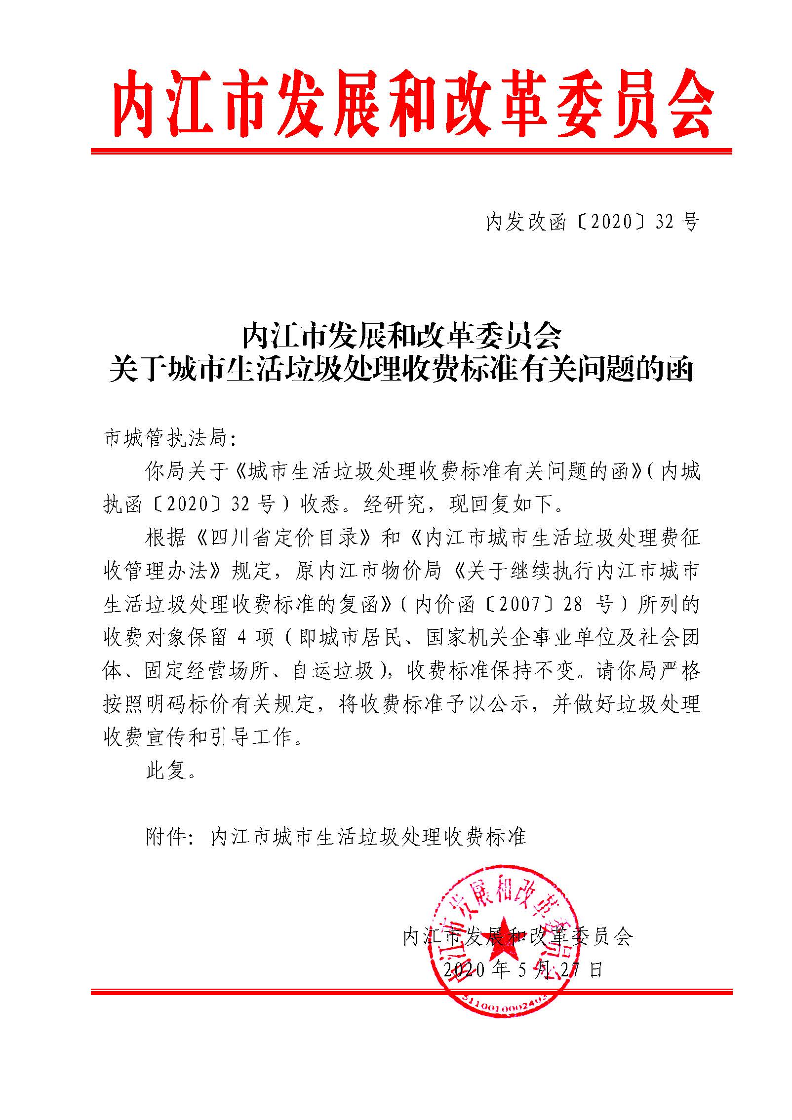 内江市发展和改革委员会关于城市生活垃圾处理收费标准有关问题的函