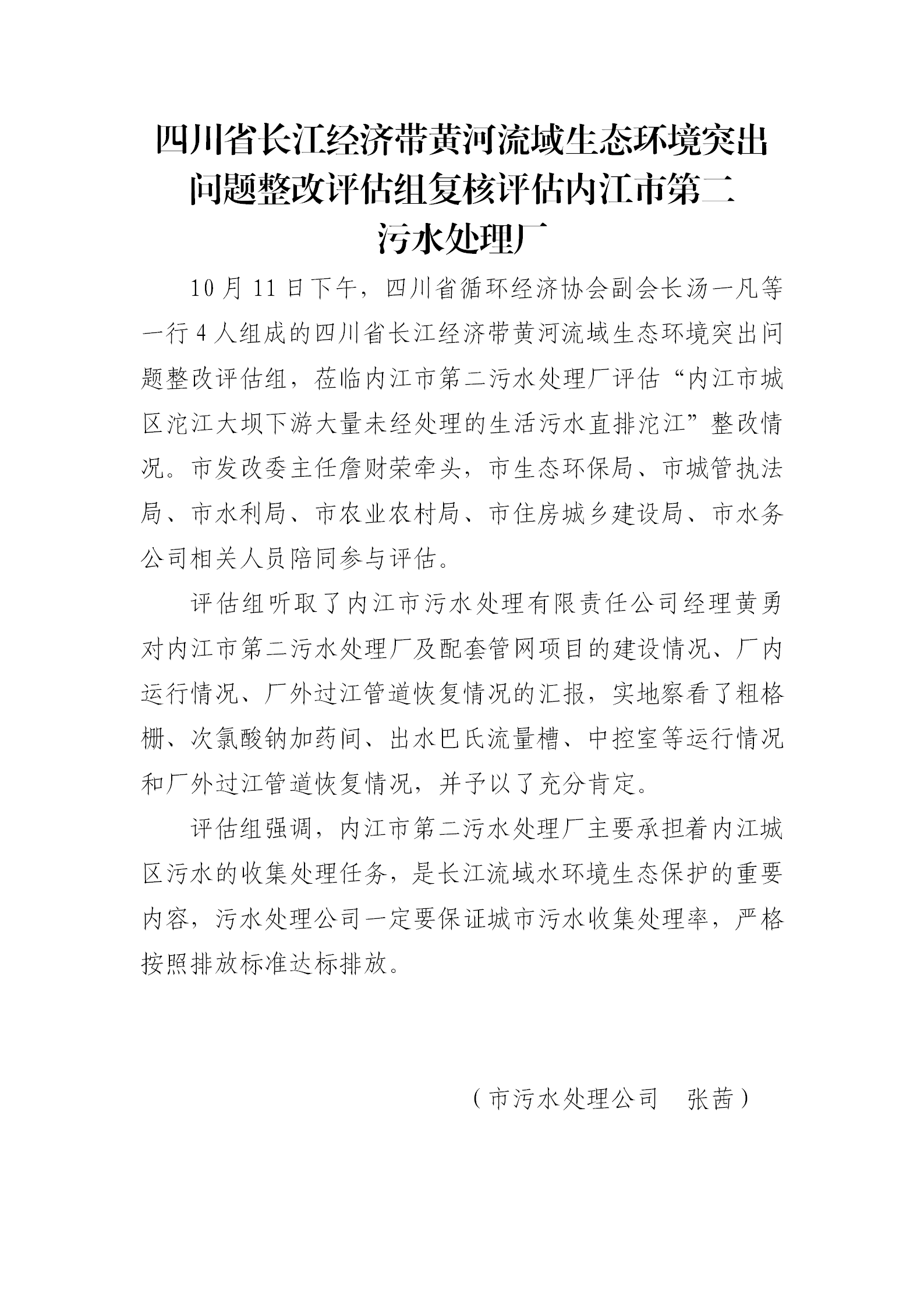 四川省长江经济带黄河流域生态环境突出问题整改评估组复核评估内江市第二 污水处理厂