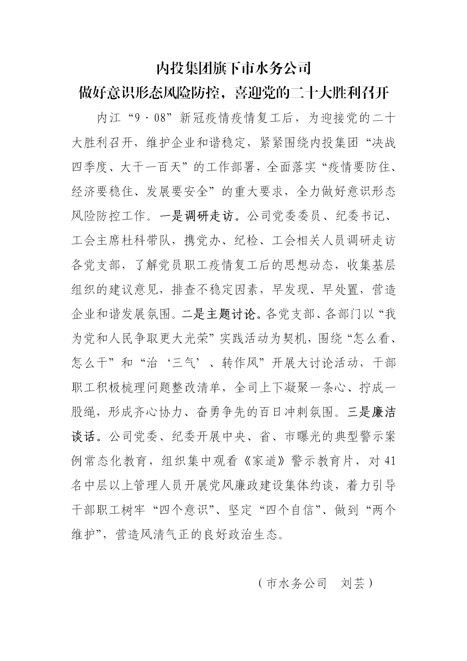 内投集团旗下市水务公司 做好意识形态风险防控,喜迎党的二十大胜利召开
