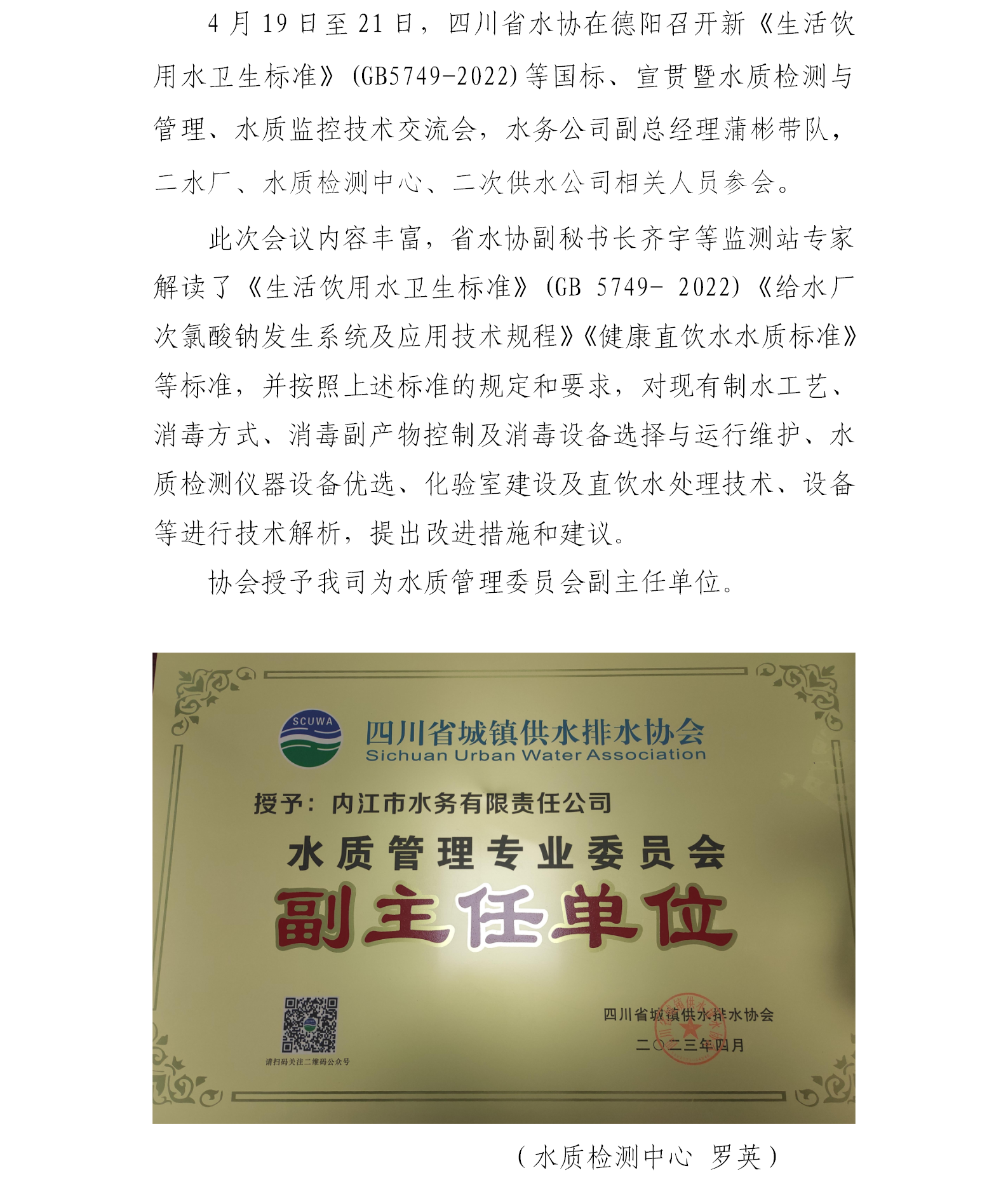 内江市水务公司获省水协授予水质管理专业委员会副主任单位