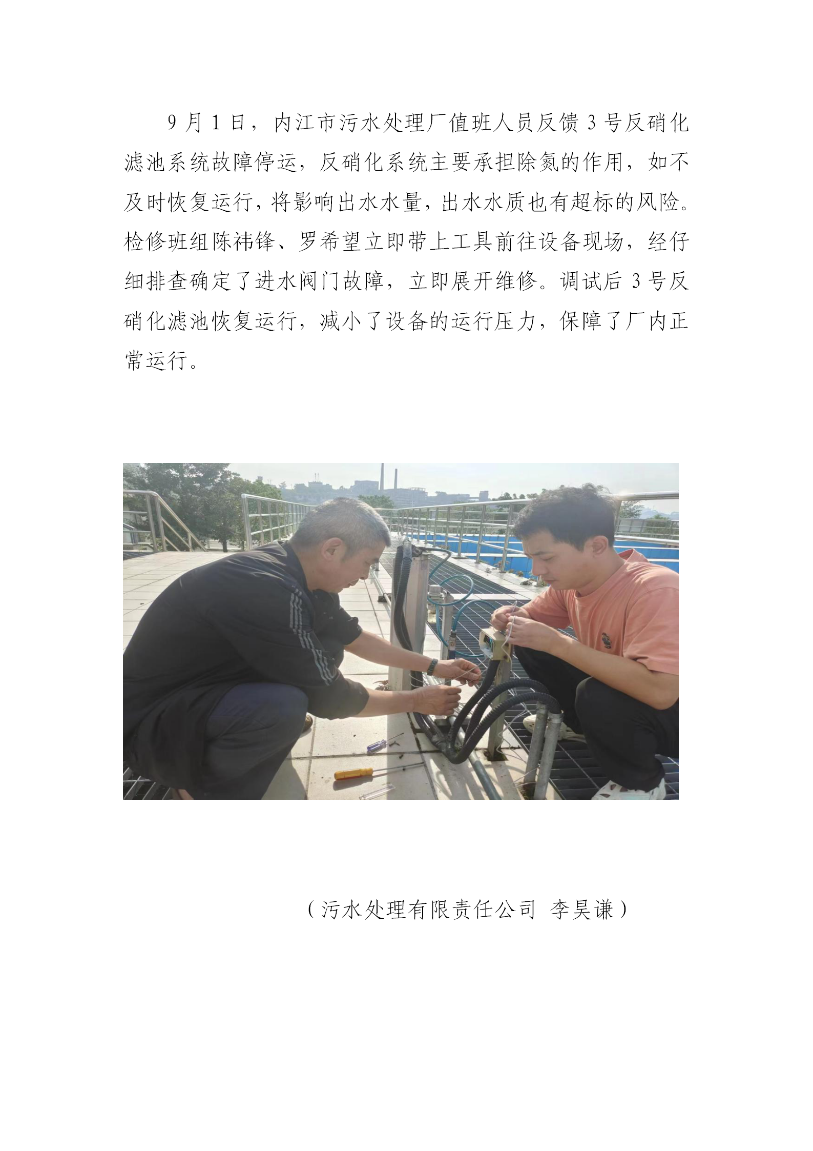 内江市污水处理有限责任公司第一污水处理厂维修反硝化滤池故障