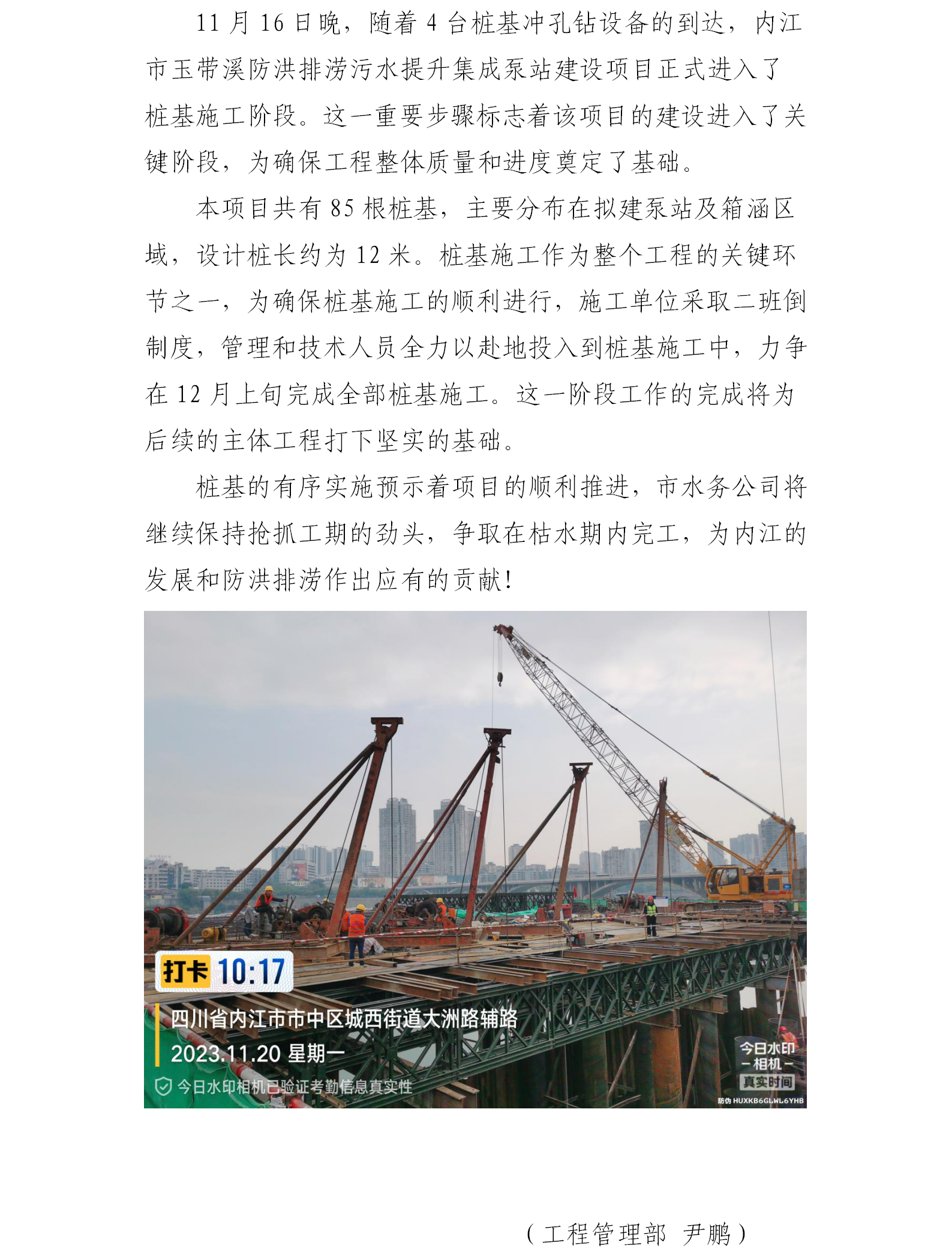 内江市玉带溪防洪排涝污水提升集成泵站建设项目进入桩基施工阶段